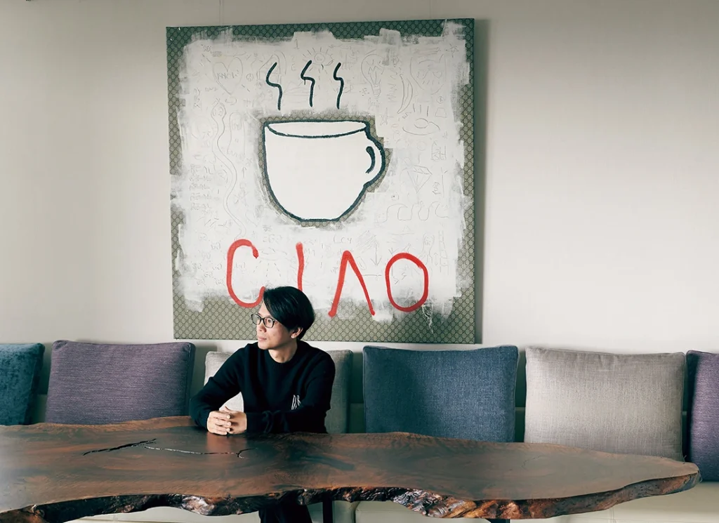 内永さんの背景には、大きなカップの絵画が飾ってあります。