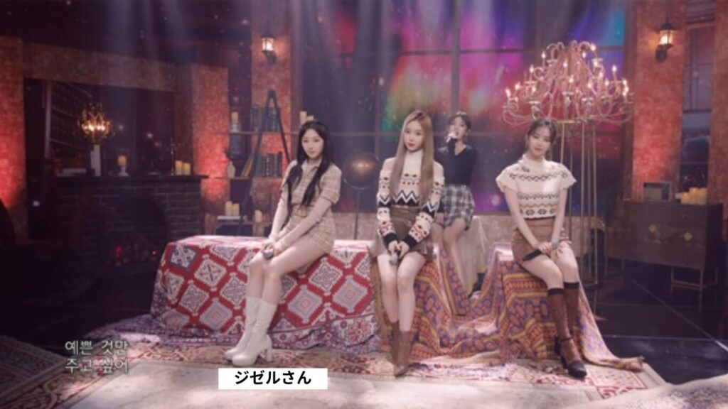 韓国オンライン・コミュニティに掲載されたキャプチャ画像。「ジゼル」の座高の低さがかなり目立っています。他のメンバーより圧倒的に低く、「遠近法?」「一人だけ後ろに座ってる?」と思えるぐらい。画像は加工されていません。