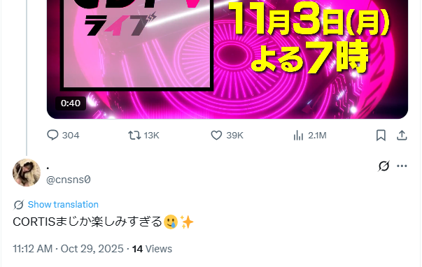 11月3日の放送は2時間生中継ということなのでライブさながらのCORTISの姿が見られるのはとても楽しみですね。
