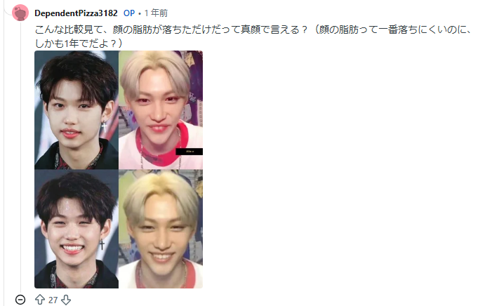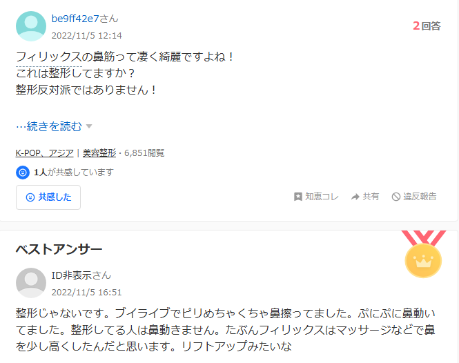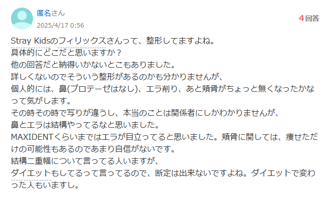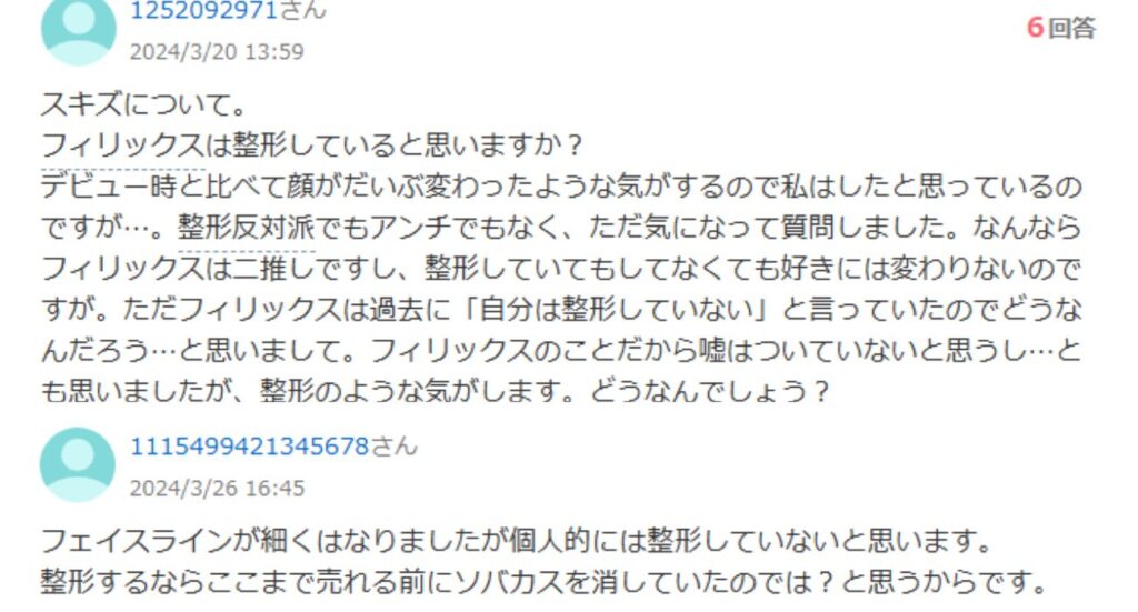 フィリックスさんの鼻について、デビュー当初と比べると鼻に変化があり、“整形しているのではないか”?というコメントが多く目立ちました。