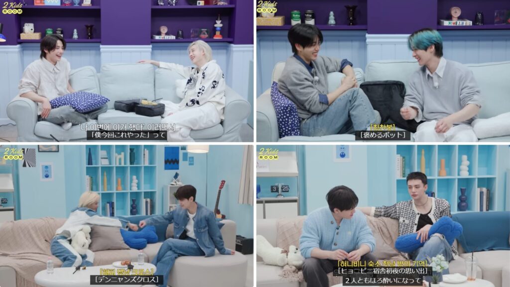 StrayKidsのYouTube「2kids room」を見ると、宿舎での生活風景も垣間見えて仲の良さも感じられます。