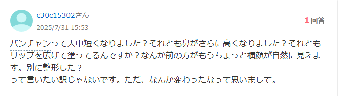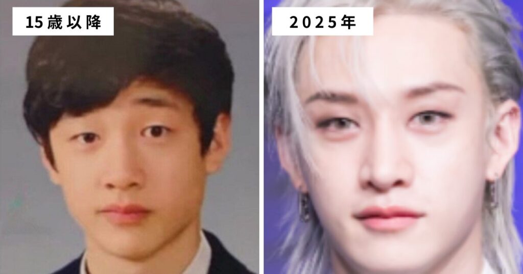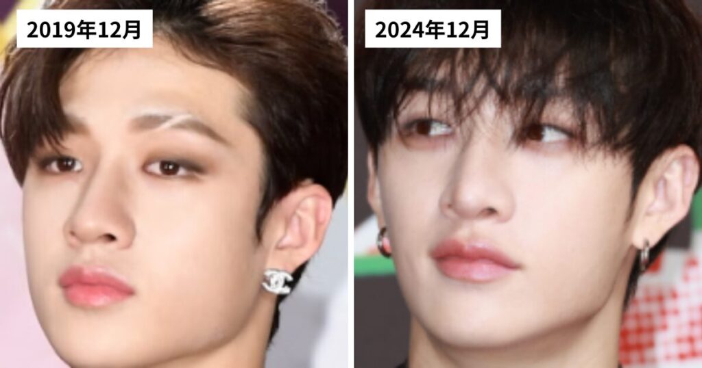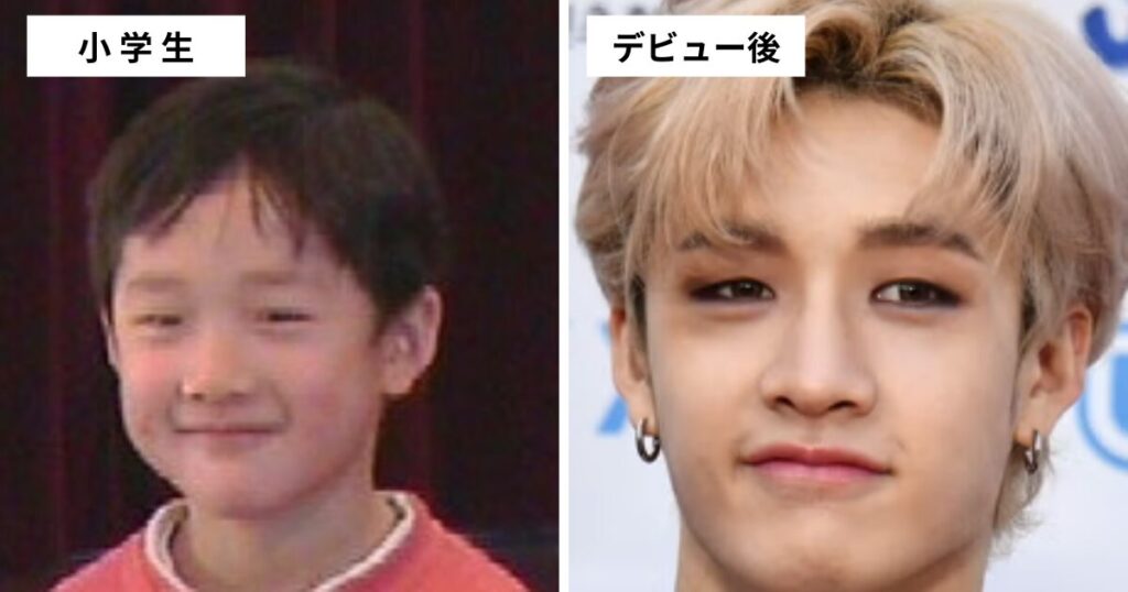 現在のバンチャンさんと比べるとヘアメイクで変化を見つけるのは難しいですが、顔のメインのパーツ(目・鼻・口)は大きな変化は見つかりませんでした。