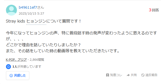 StrayKidsメンバーのヒョンジンさんの声を心配する声が、2025年10月頃から「ヒョンジンの声変わった?」というコメントが多く見られました。