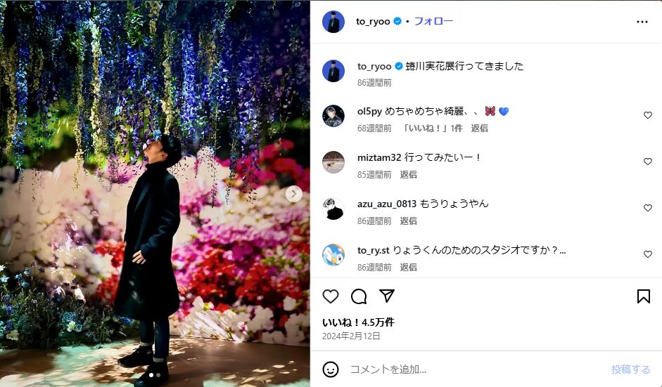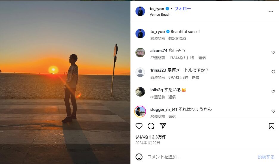 りょうさん本人のコメントはありませんでしたが、コメント欄は「それはデートやん」「絵になるなぁ」などの祝福コメントで賑わいました。