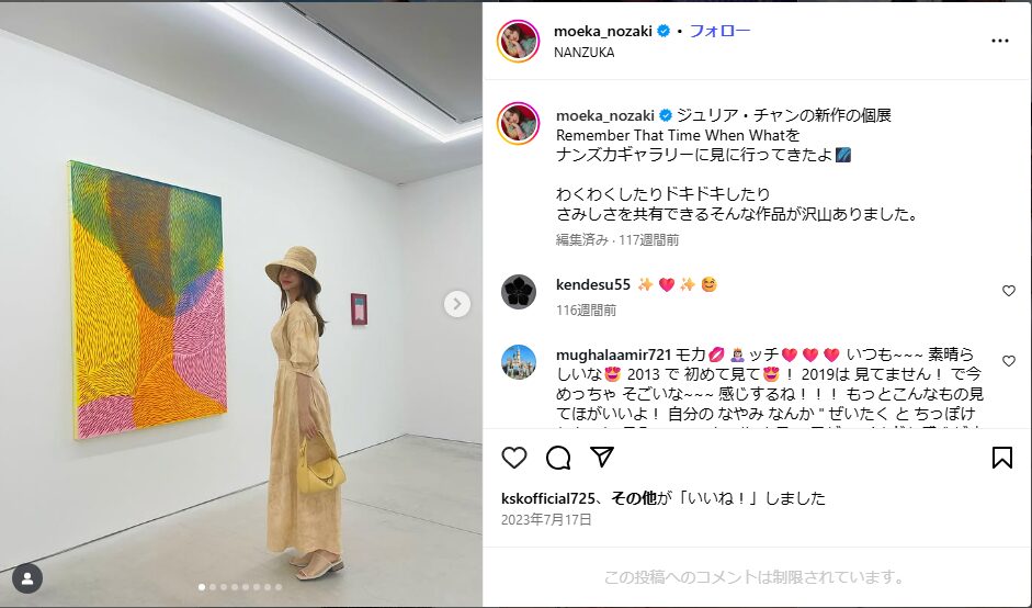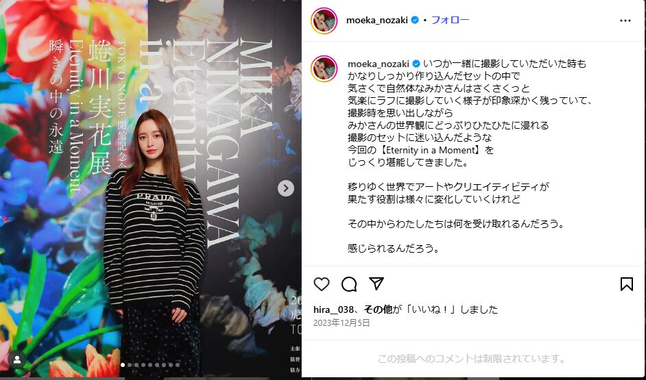 東海オンエアりょうさんと野崎萌香さんが噂になったもう一つの共通する写真が、蜷川実花展での写真です。こちらもInstagramに投稿された日付は…