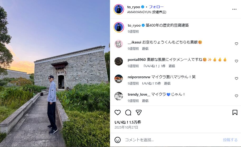 2025年10月にりょうさんのinstagramで、上海の様子をアップしている投稿がされました。