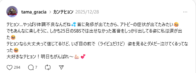 TXTは2025年11月から日本でのライブ活動をしていましたが、その中でメンバーのテヒョンさんの首の湿疹について心配する声がSNS上で多く見られました。
